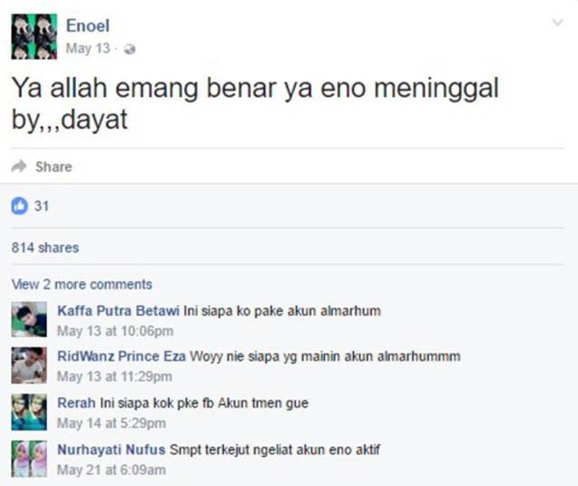 Gimana kalau ada orang yang meng-update status setelah kematiannya? Gak kebayang horornya. Akun Facebook gadis yang ditemukan tewas dengan gagang pacul menancap di kemaluannya ini sempat menggegerkan Facebook karena adanya update status setelah ia meninggal. Usut punya usut, ternyata status ini diupdate oleh mantan kekasih yang mengetahui email dan password Eno.