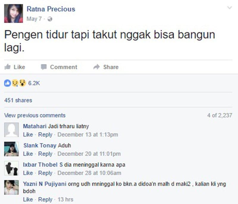 Tampaknya benar terjadi ketakutan dari Ratna. Setelah mem-posting status di atas, gadis asrama ini tidur untuk selamanya. Hal ini terjadi setelah ia meminum obat malaria dalam jumlah berlebihan hingga terjadi overdosis.