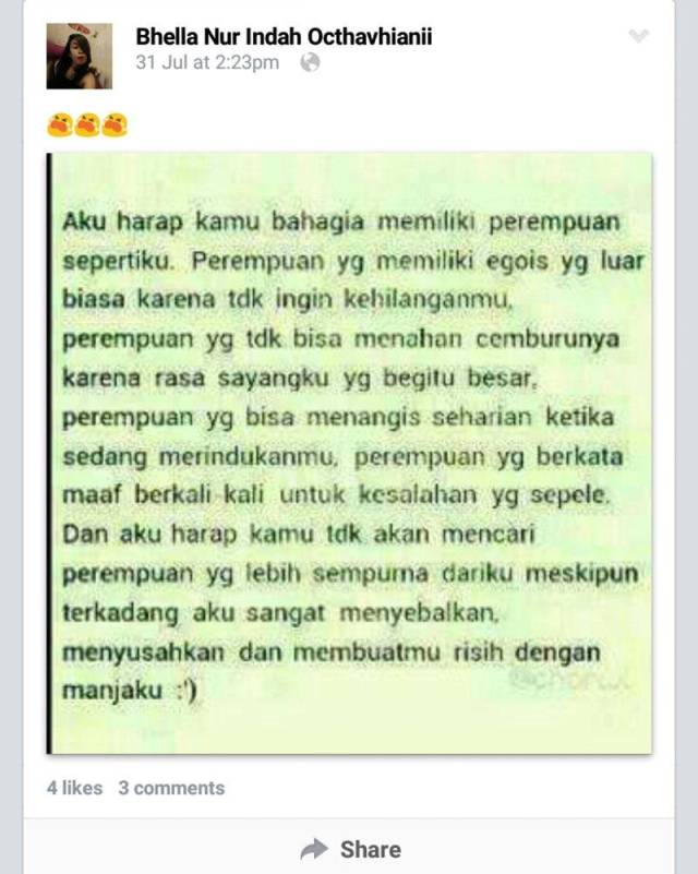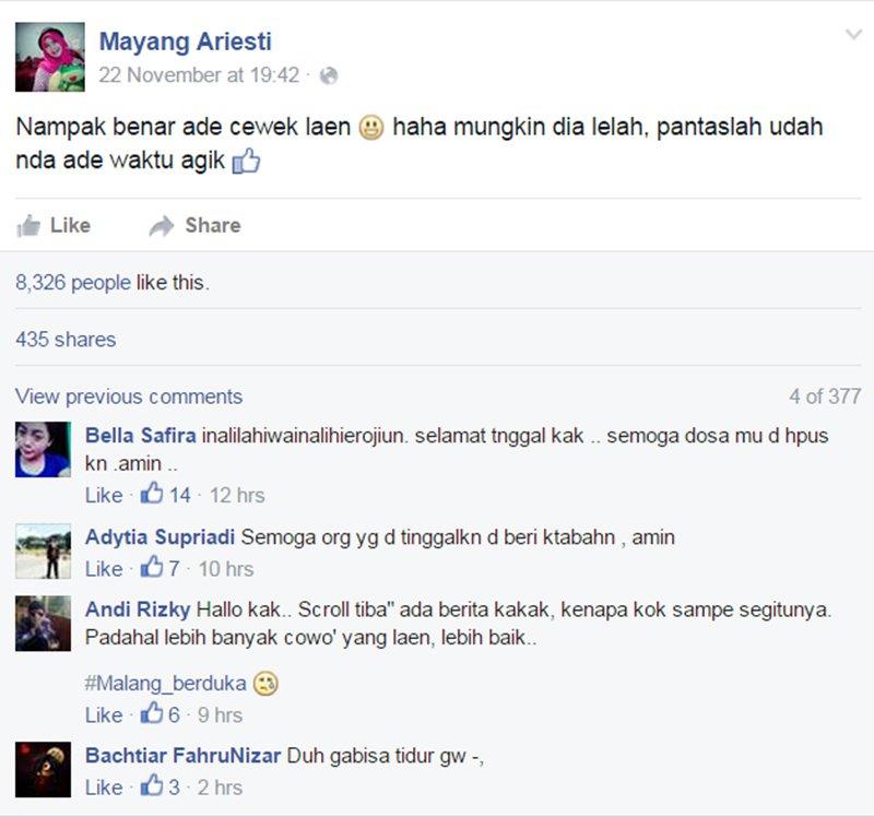 Tidak hanya sekali, berkali-kali dan telah cukup lama gadis yang baru berumur 16 tahun ini meng-update status di Facebook yang berisi sindirannya terhadap kekasihnya. Setelah rangkaian status tersebut, ia ditemukan gantung diri di kamarnya. Makanya, cinta jangan sampai malah membuat diri kita tertekan, ya.