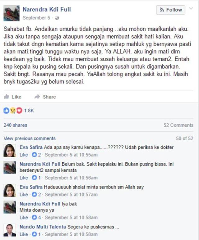 40 hari sebelum nyawanya direnggut oleh meningitis, ia sempat menceritakan tentang kesakitan hebat yang dialaminya, dan meminta maaf pada rekan-rekannya jika pernah membuat salah, andai-andai umurnya tidak panjang.