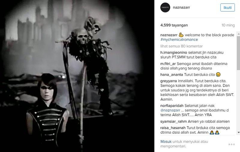 Melalui akun Instagramnya, @naznazarr, ia mengunggah potongan video musik dari My Chemical Romance yang berjudul Welcome To The Black Parade. Lirik lagu ini sendiri sangat sarat dengan kematian.