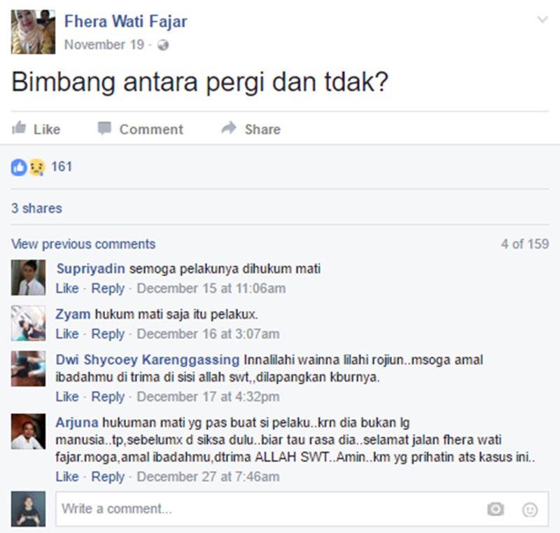 Status Bella sebelum dibunuh kenalannya di Facebook adalah status galau bahwa ia tidak ingin ditinggalkan seseorang. Ada netizen yang berkomentar bahwa dalam posisi lemah seperti itu, perempuan memang lebih mudah diperdaya dan rentan terhadap kejahatan.