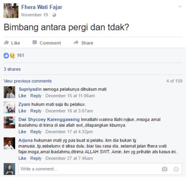 Begitu status terakhir Verawati, seorang gadis berusia 19 tahun yang tewas diperkosa dan dibunuh sepupunya sendiri, lalu dibuang ke semak-semak. Seakan status tersebut mengindikasikan perasaan buruknya akan kejadian naas yang dialaminya kemudian.